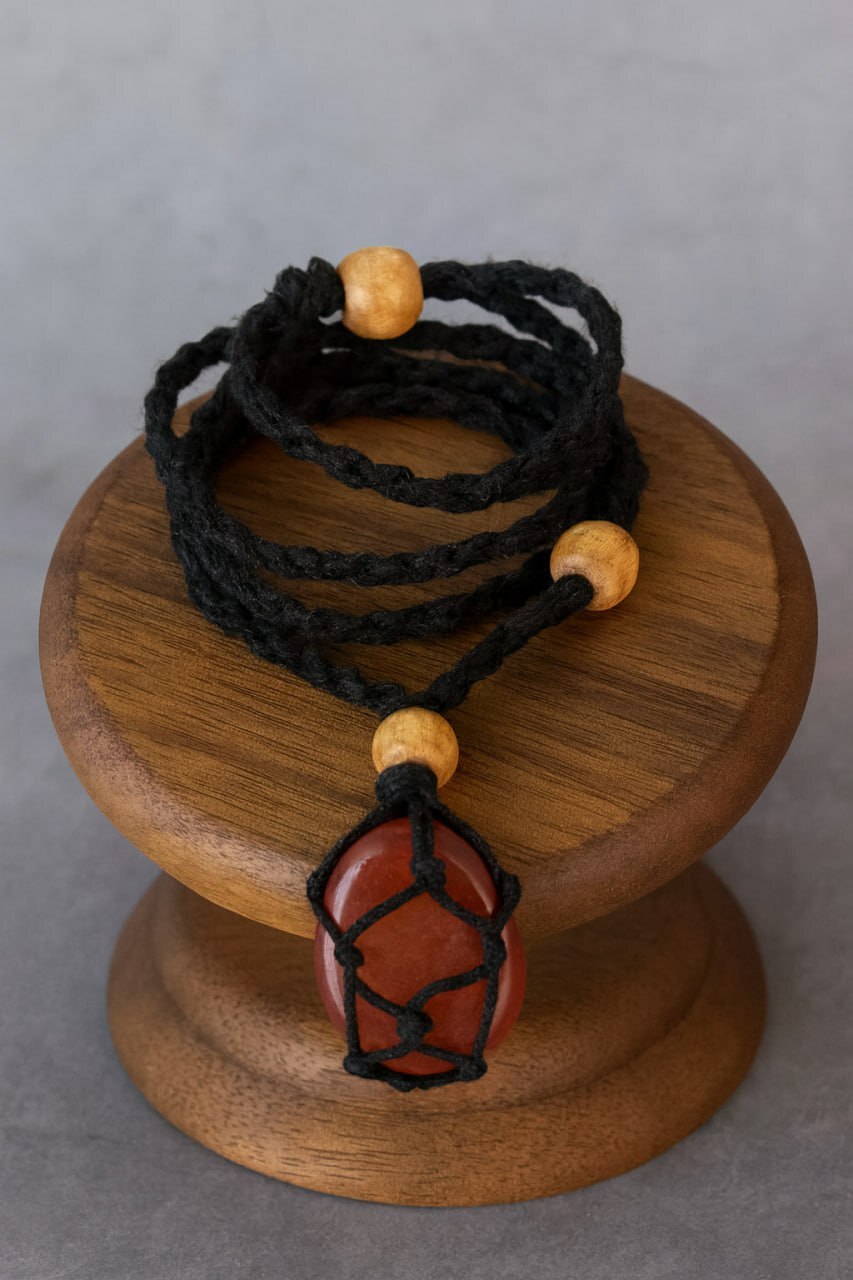 Амулет на шнурке и выполнен из натурального сердолика.